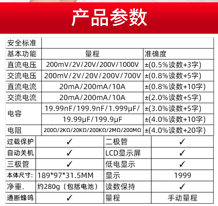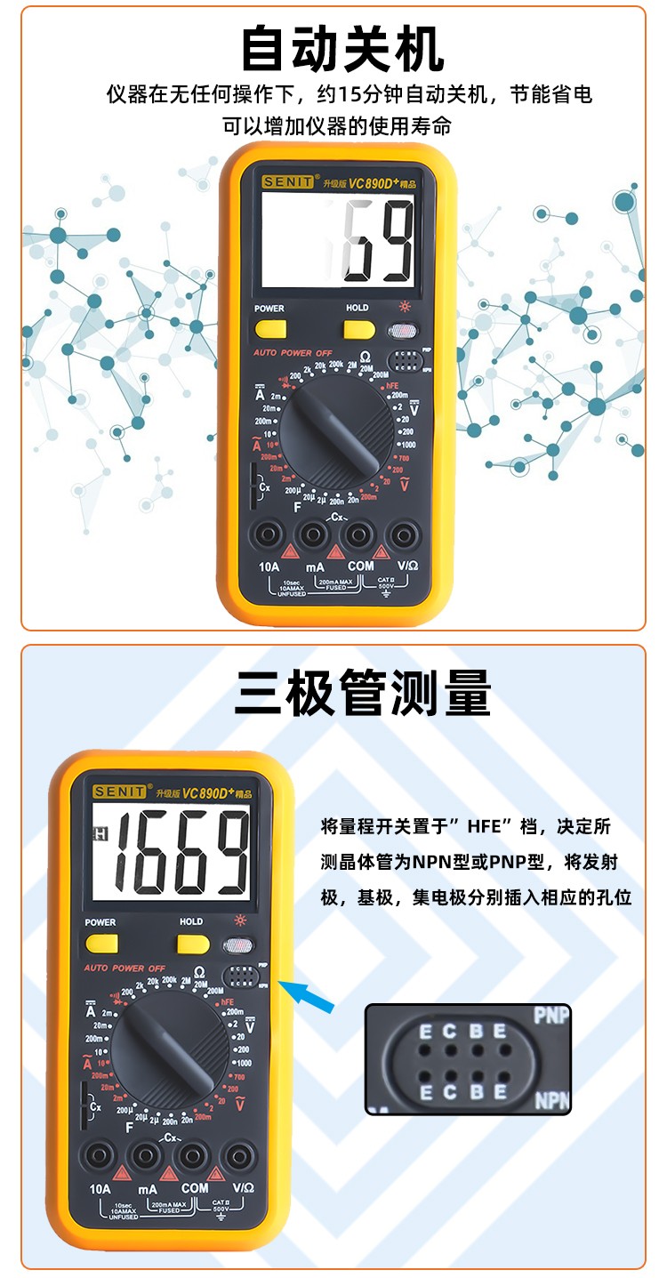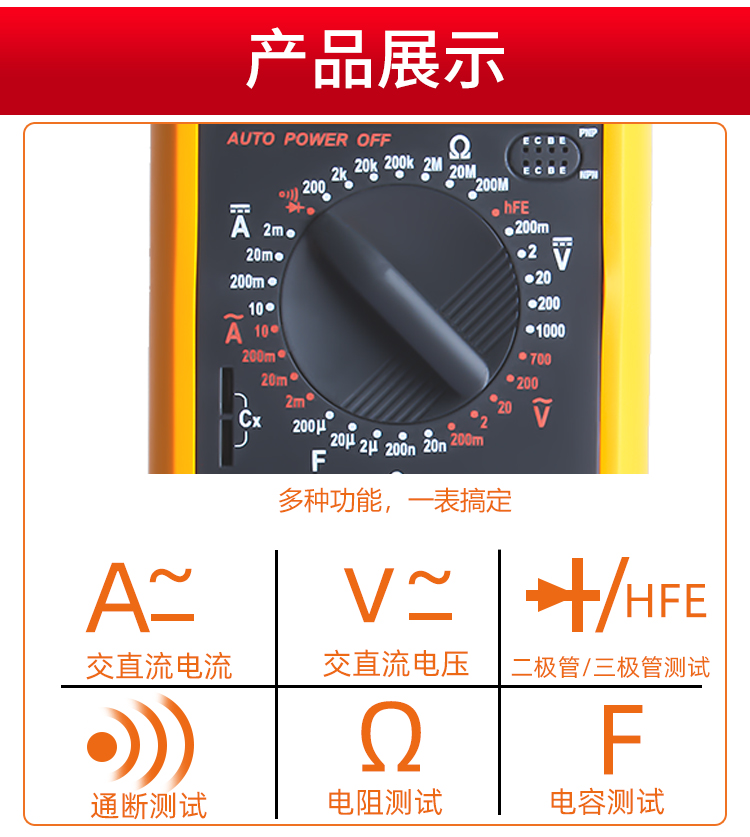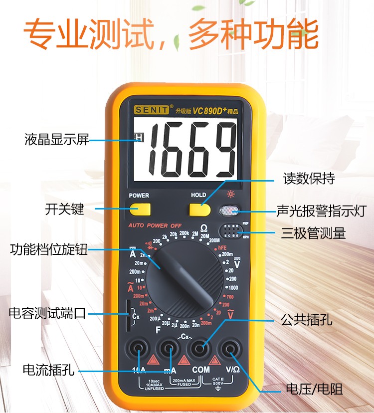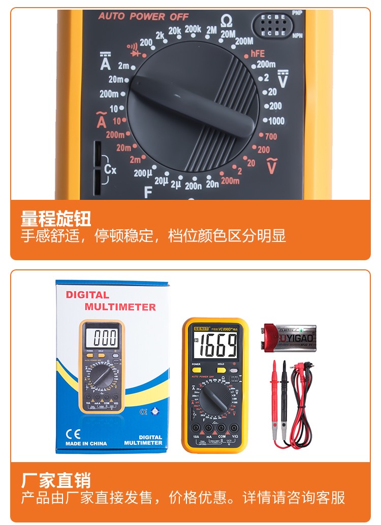 1. 全保护功能,防高压打火电路设计 2. 新型防震套,流线形设计,手感舒适 3. 大屏幕显示,字符清晰 4. 抗干扰能力强