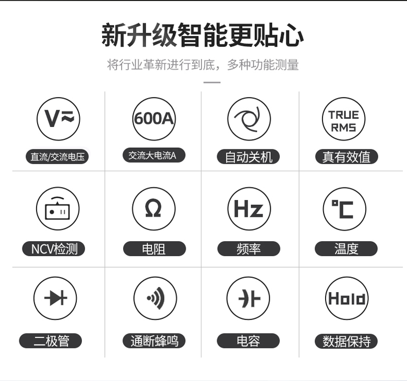 产品采用紧凑人体工程学设计(尺寸 190 × 71 × 30 mm),重量仅 168g(不含电池),钳口开口宽度达 30mm,便于狭小空间操作。由两节 1.5V AAA 电池供电,支持自动关机以延长电池寿命,并内置手电筒照明,适用于低光环境。无论测试电路、验证导通还是测量高达 600A 的高负载,这款钳形表都注重精度、安全和用户便利性。