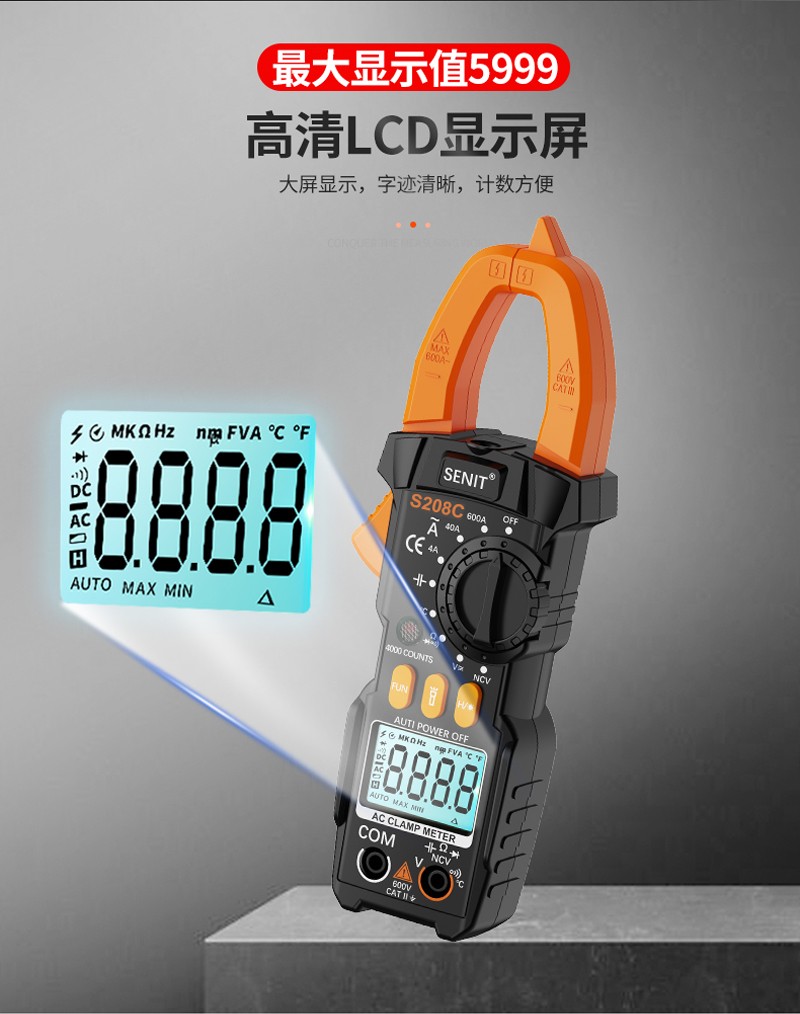 SENIT 208C 是一款专为电工设计的高精度多功能钳形表,集电流、电压、电阻、电容及频率测量功能于一体。