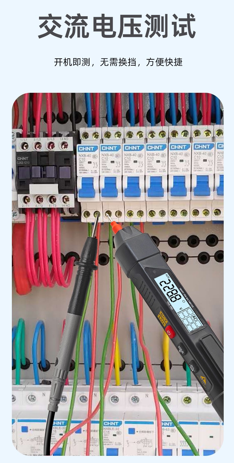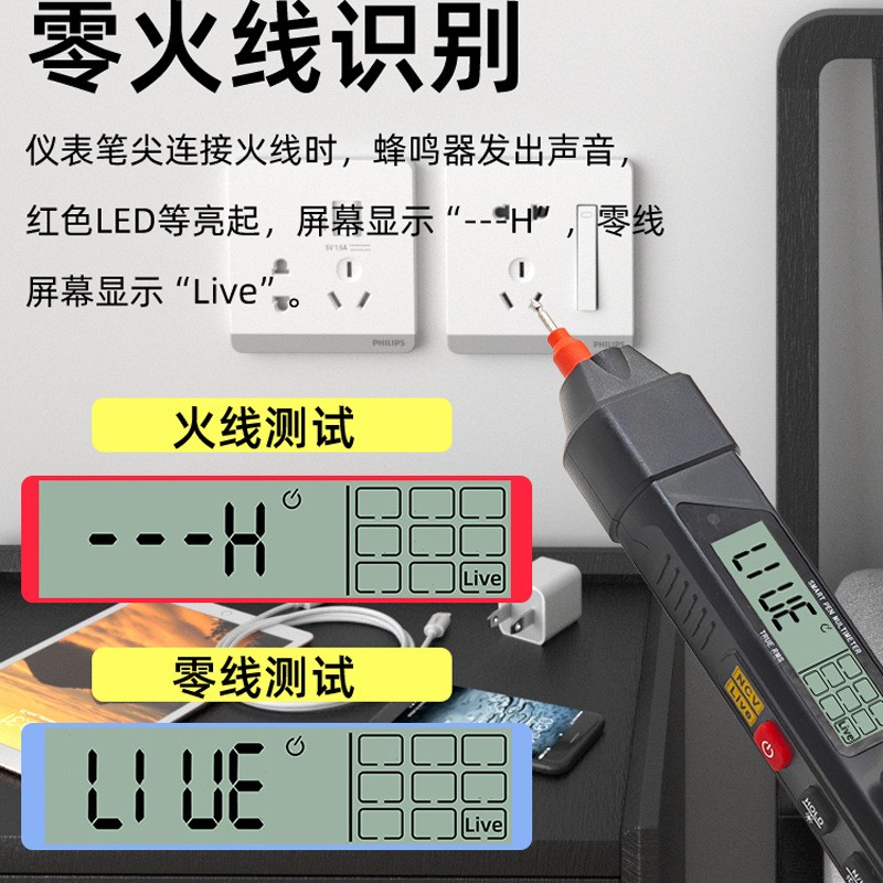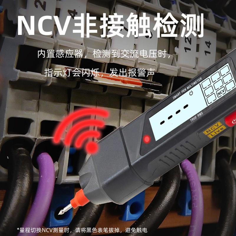 非接触电压检测 (NCV):无需直接接触导线,通过感应快速识别高压电场,避免触电风险。适用于墙内线路、插座和配电箱的安全扫描。